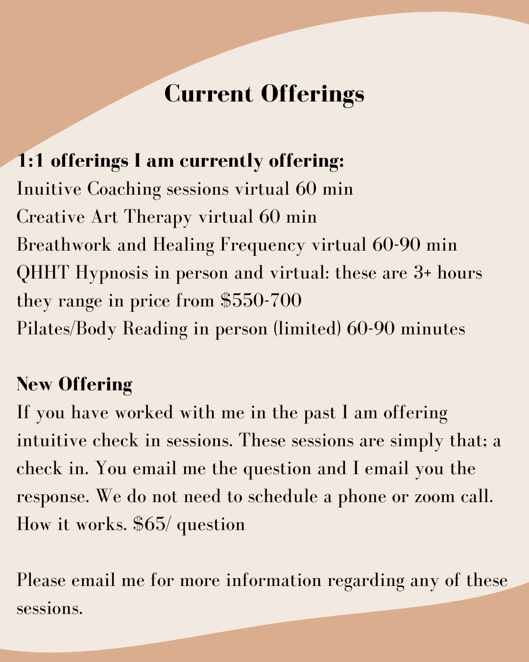 I work best with clients who are on a physical or emotional journey and are ready to actively explore, reframe, and integrate patterns and lessons. While I address love, relationships, grief, money, career, and creative blocks, my focus is primarily on the physical and emotional aspects of these experiences. I am not a business coach or a nutritionist—my work is centered on deepening the connection between the body, emotions, and soul.