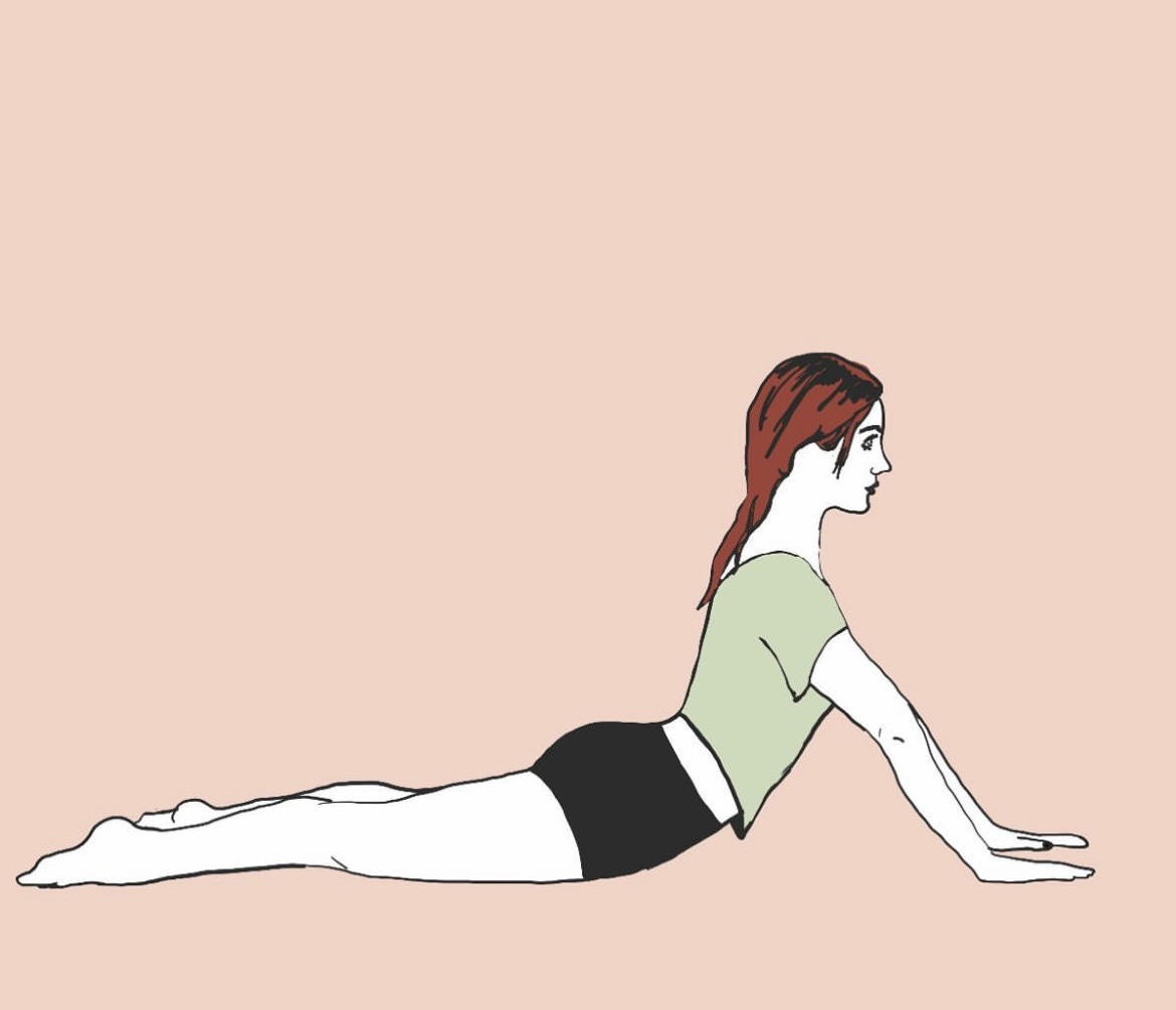 Start Position: Lie on your stomach with legs extended (little toes pressing into the mat), arms reaching forward, and forehead resting on the mat.